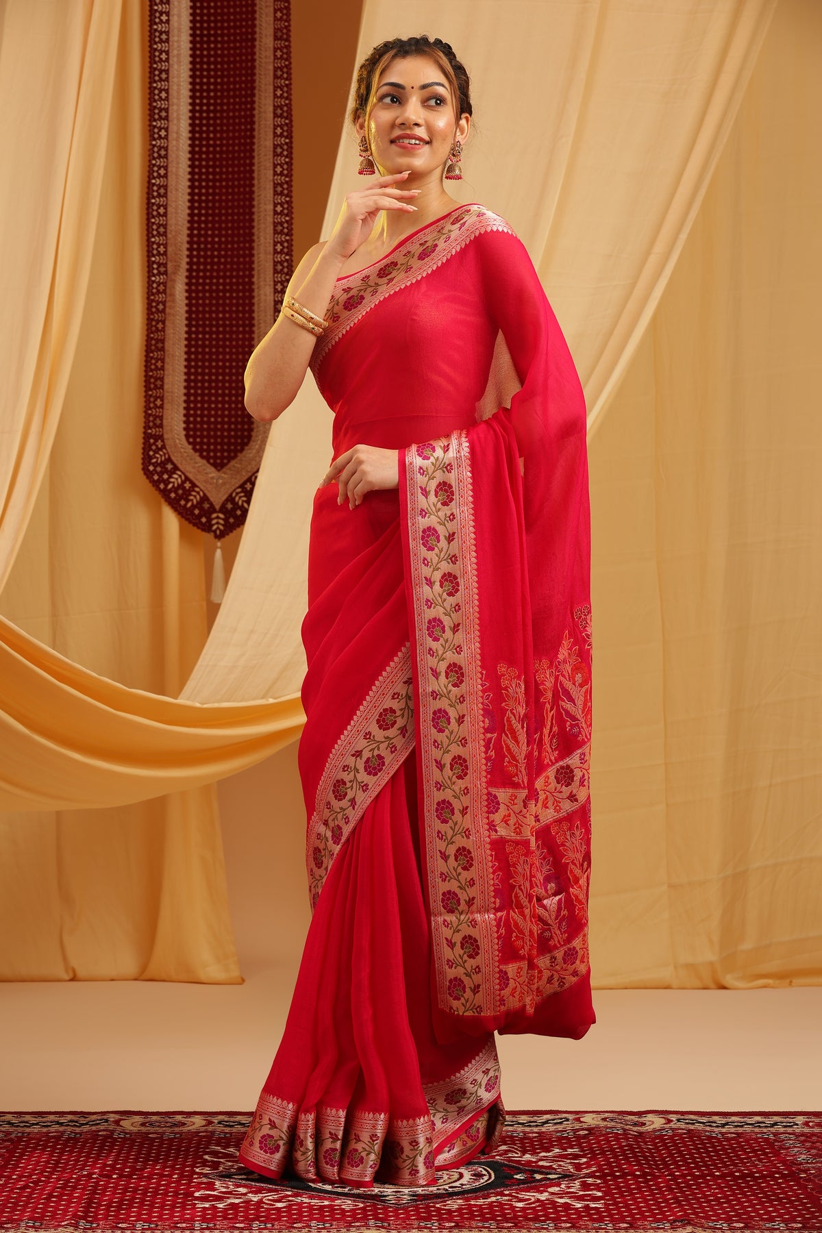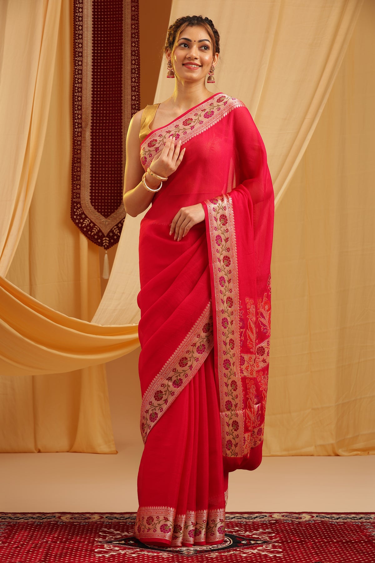Fabric: Pure Banarasi Georgette Weave: Traditional Khaddi Work: Tilfi Floral Zari Border with Plain Body Color: Rani Pink with Multi Zari Accents Occasion: Festive, Wedding, Traditional Blouse: Unstitched (included)