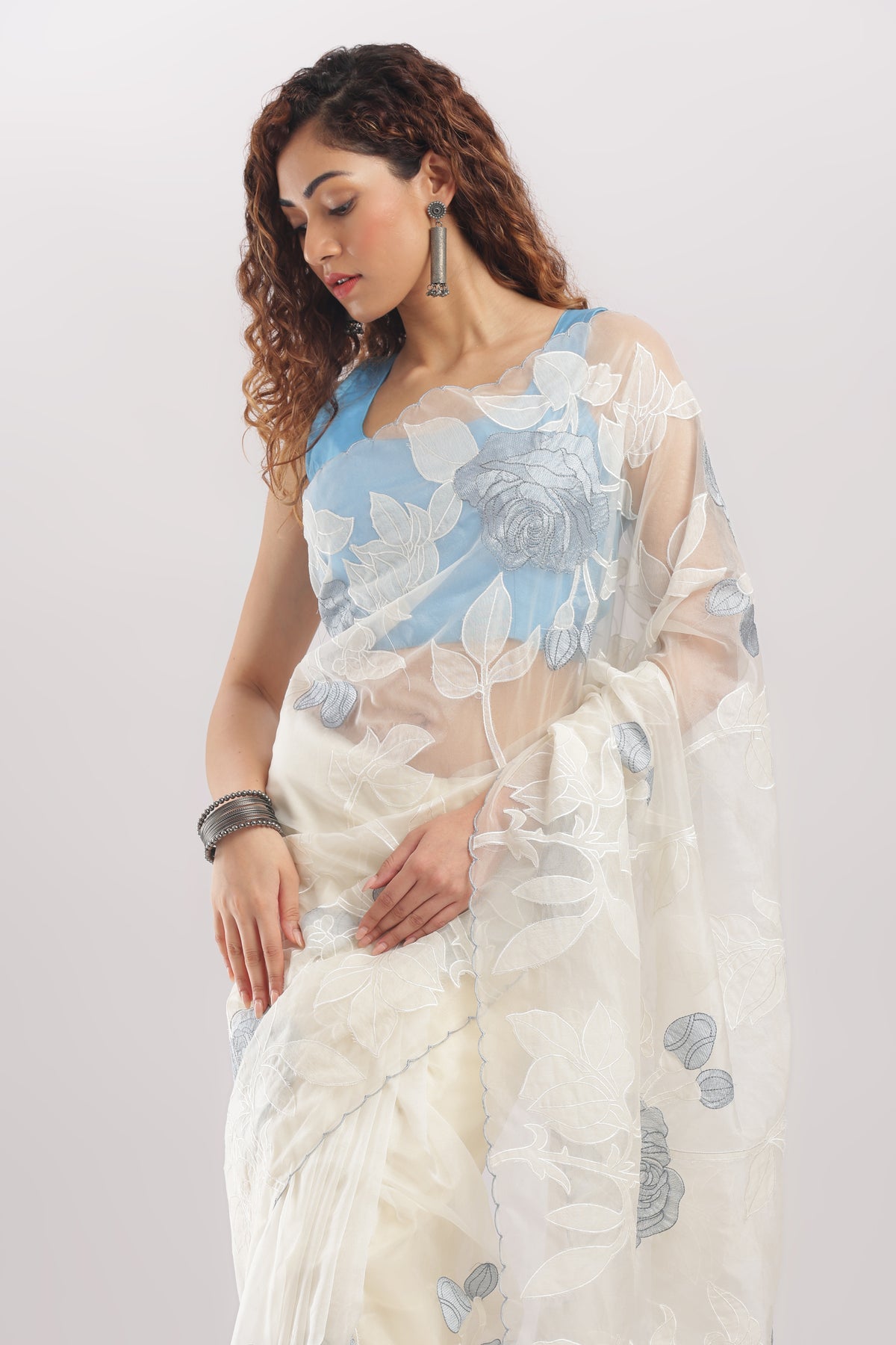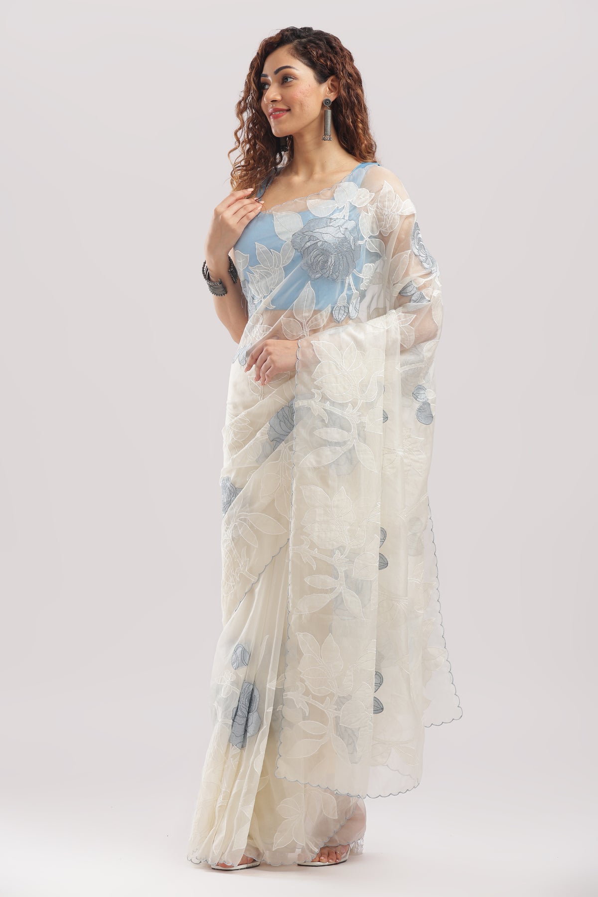 Banarasi Silk Organza Appliqué Saree - Ivory White Blue Appliqué