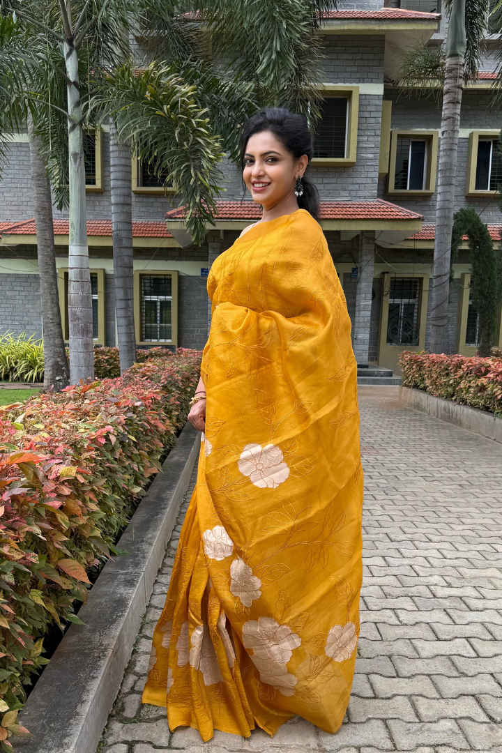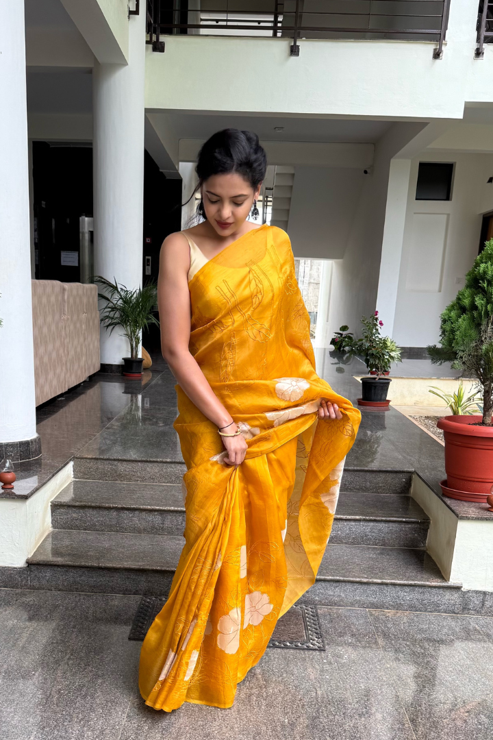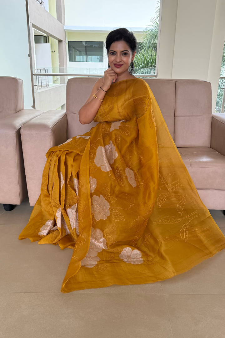 Embrace a serene yet radiant statement with this Banarasi Silk Organza Tissue Appliqué Saree in Mustard Yellow. Crafted from luxurious silk organza interwoven with delicate tissue, this saree perfectly balances ethereal lightness with a subtle, structured sheen. The drape is adorned with hand-crafted floral appliqué motifs, brought to life through intricate threadwork that reflects the finesse of traditional Banarasi artistry.
