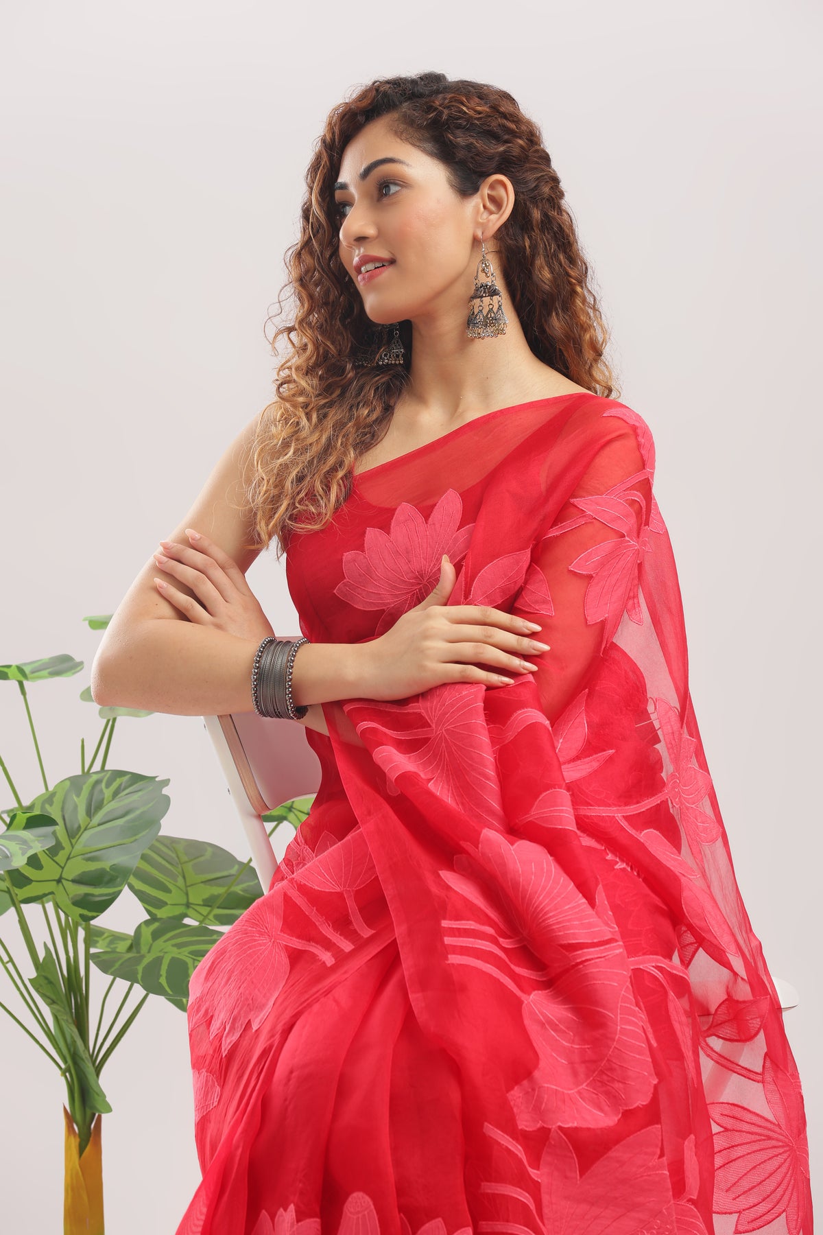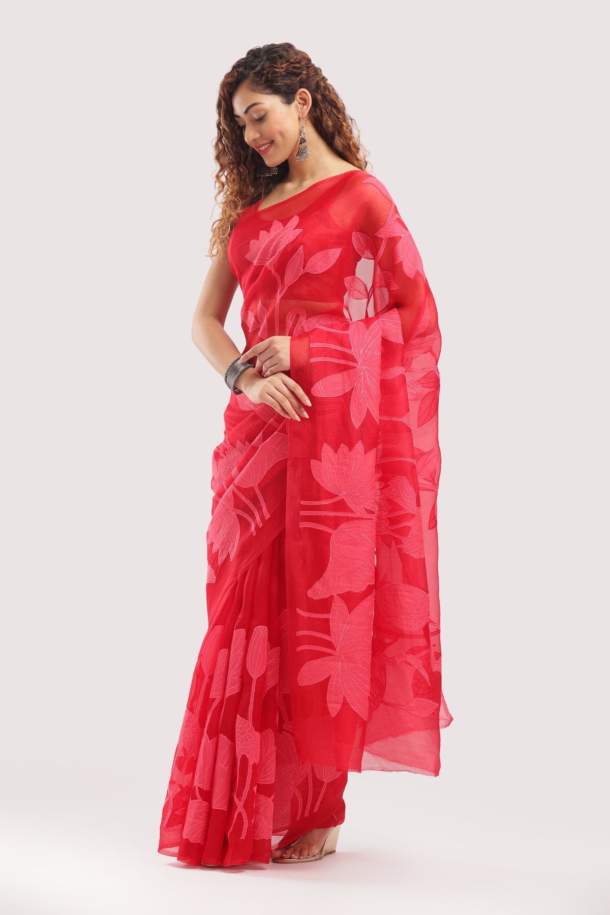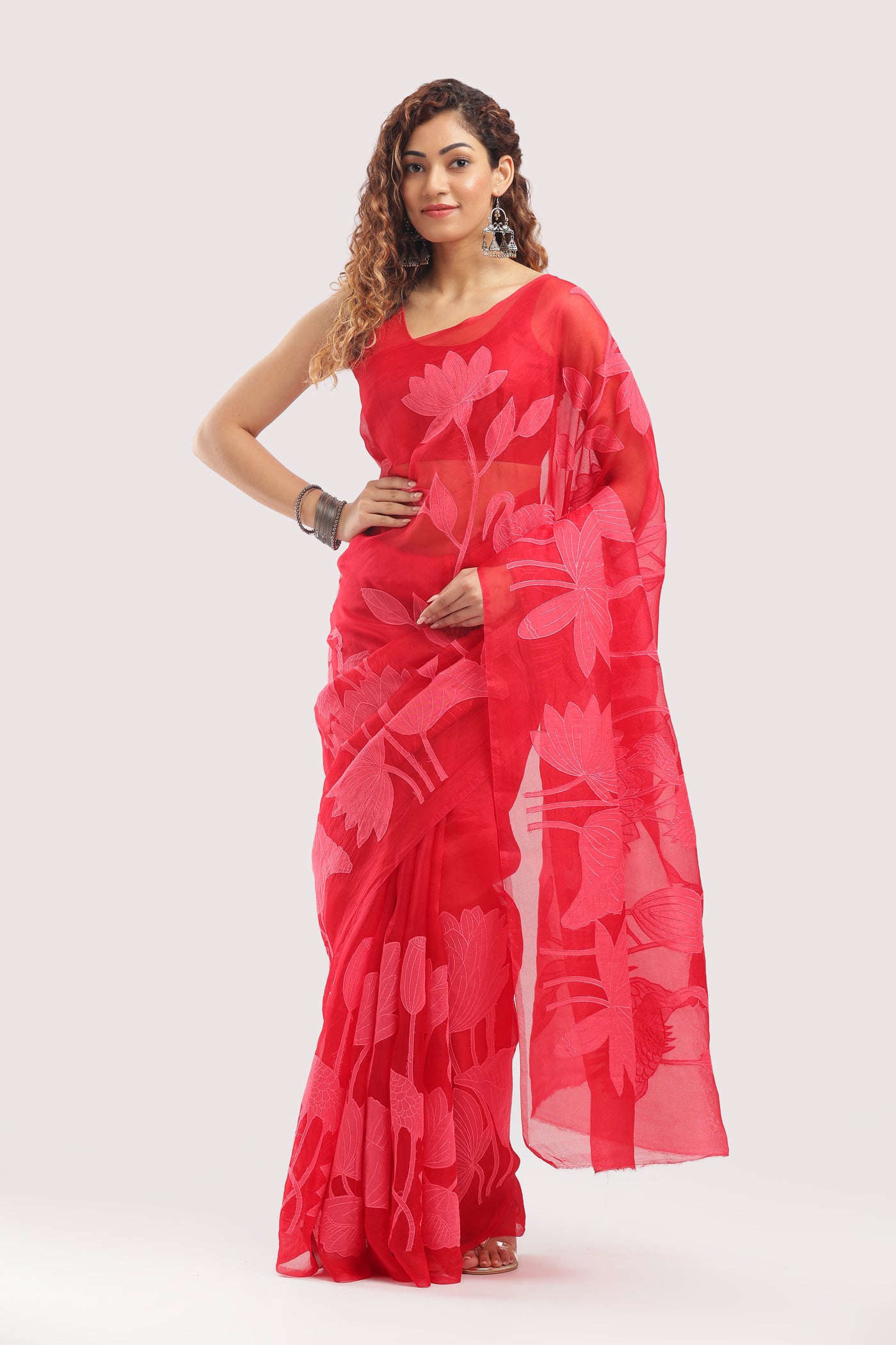 Fabric: Pure Silk Organza with Chanderi Weave: Banarasi - Chanderi Blend Work: Appliqué and Full Thread Lotus Motifs Color: Crimson Red Occasion: Festive - Celebratory - Cultural Events Blouse: Unstitched (included)