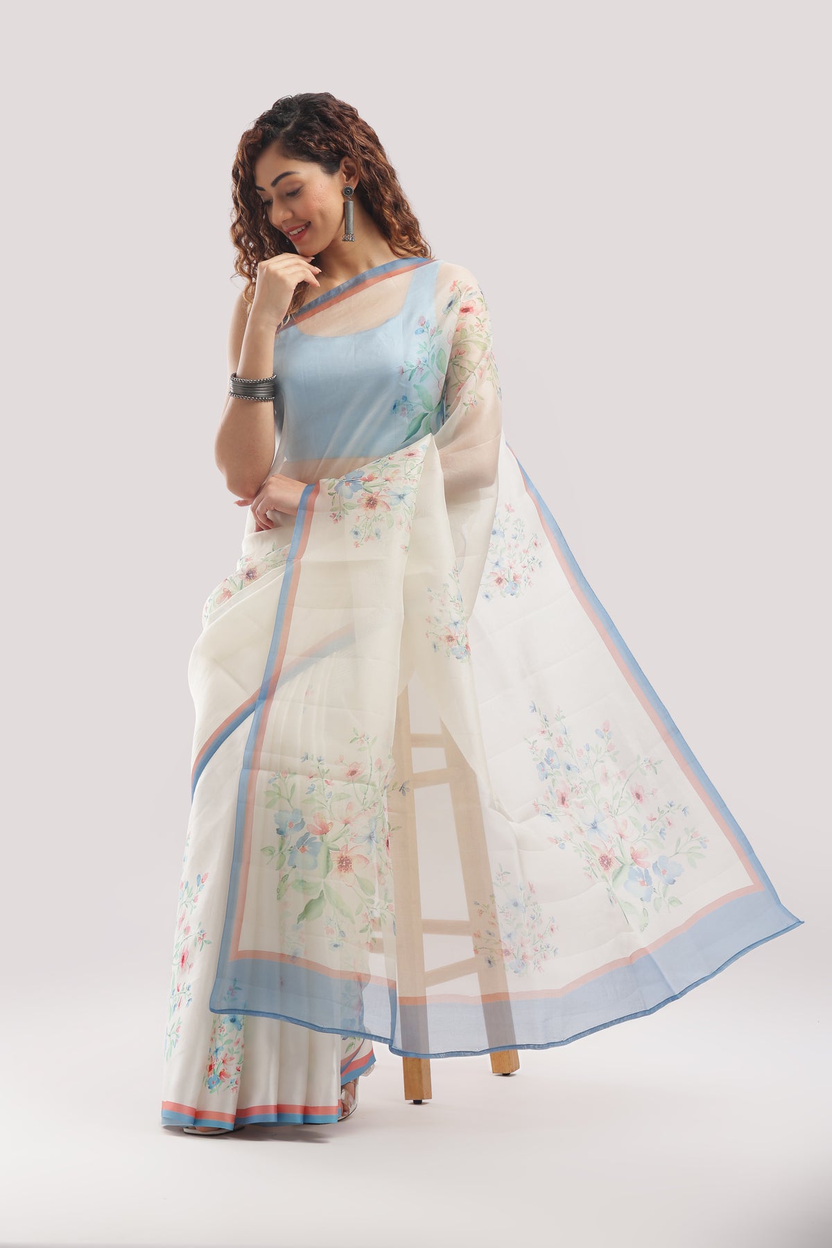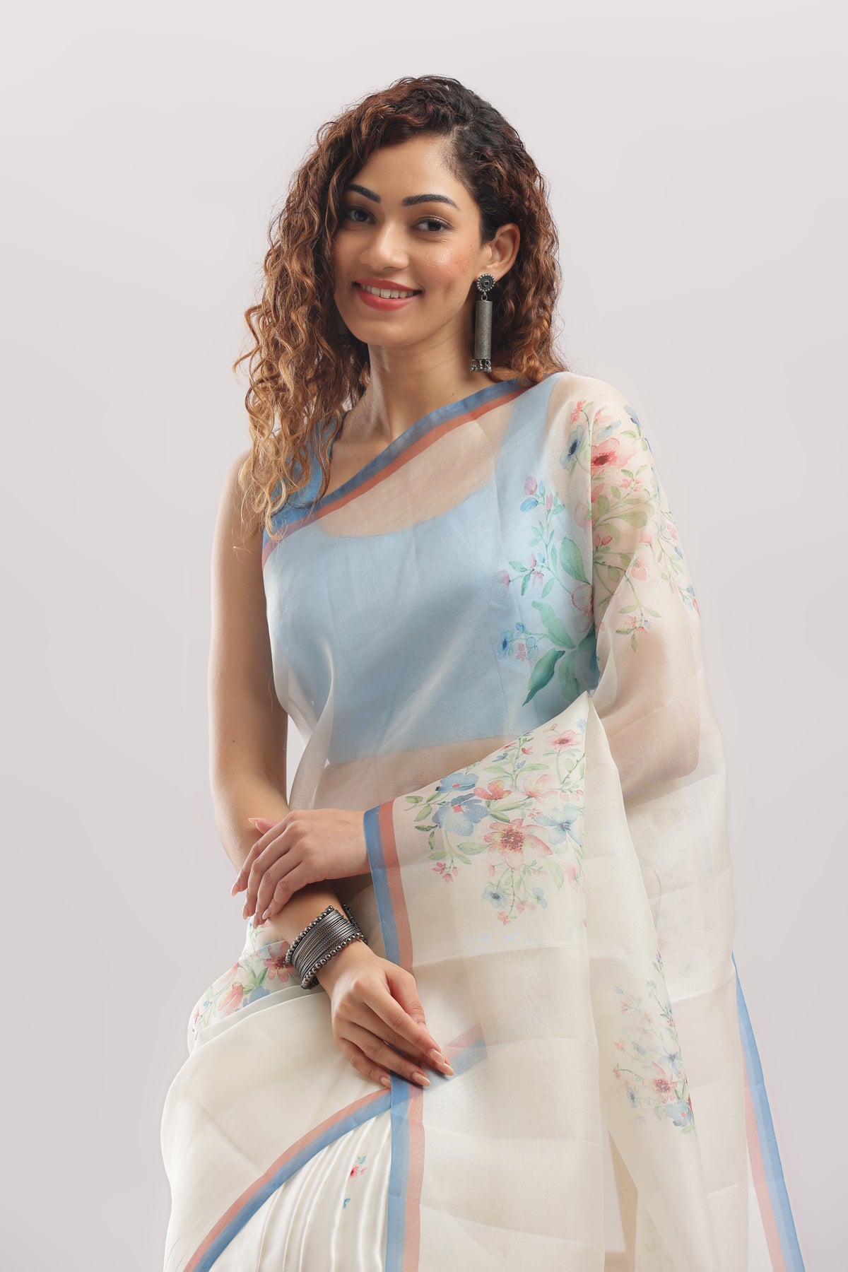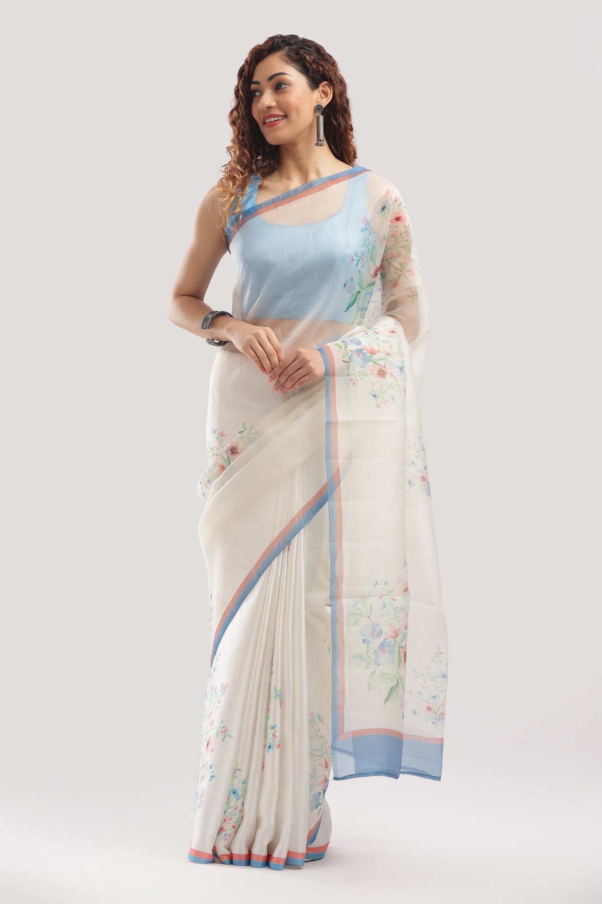 Fabric: Satin Silk Body with Organza Pallu Weave: Half and Half Work: Digital Floral Print with Contrast Border & Tassels Color: Ivory White with Pastel Floral Accents Occasion: Daytime Gatherings – Elegant Brunches – Intimate Celebrations Blouse: Unstitched (included)