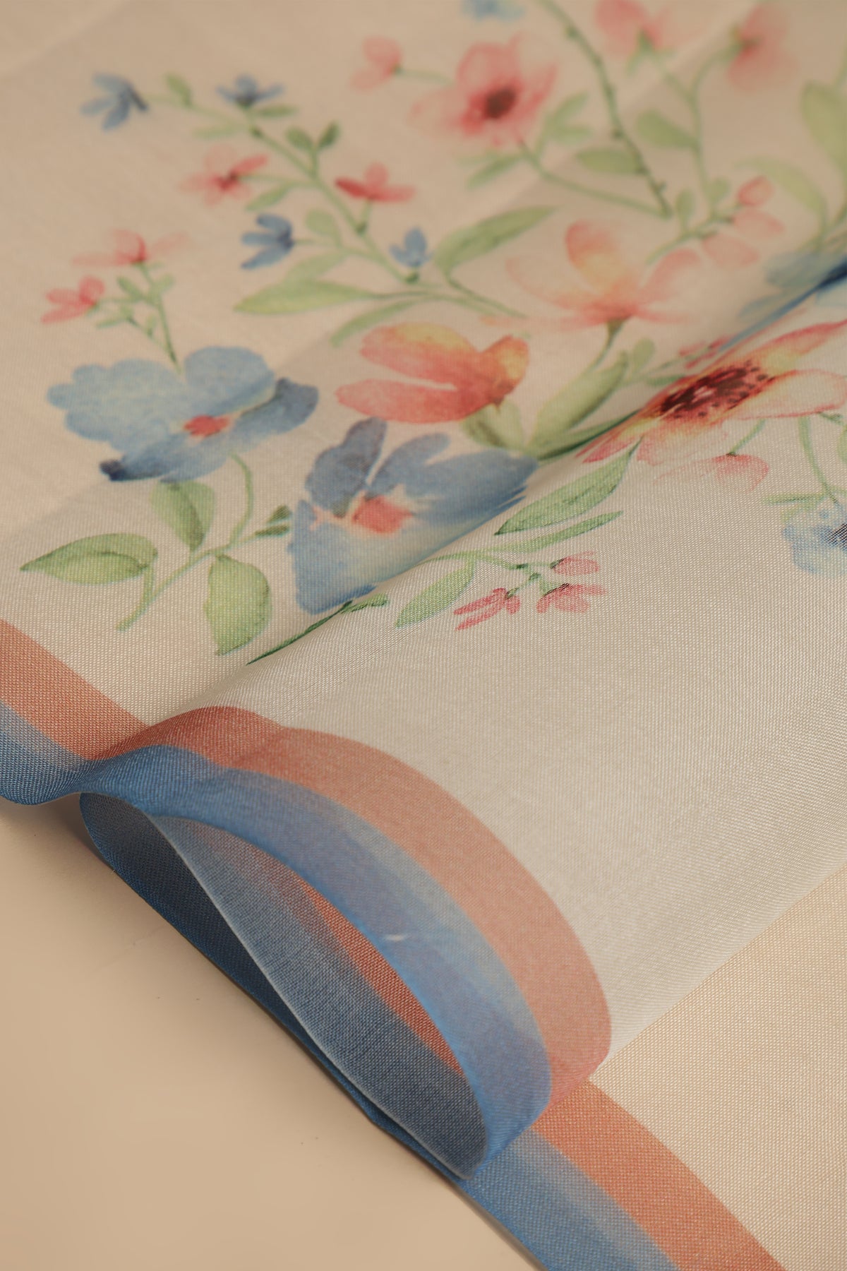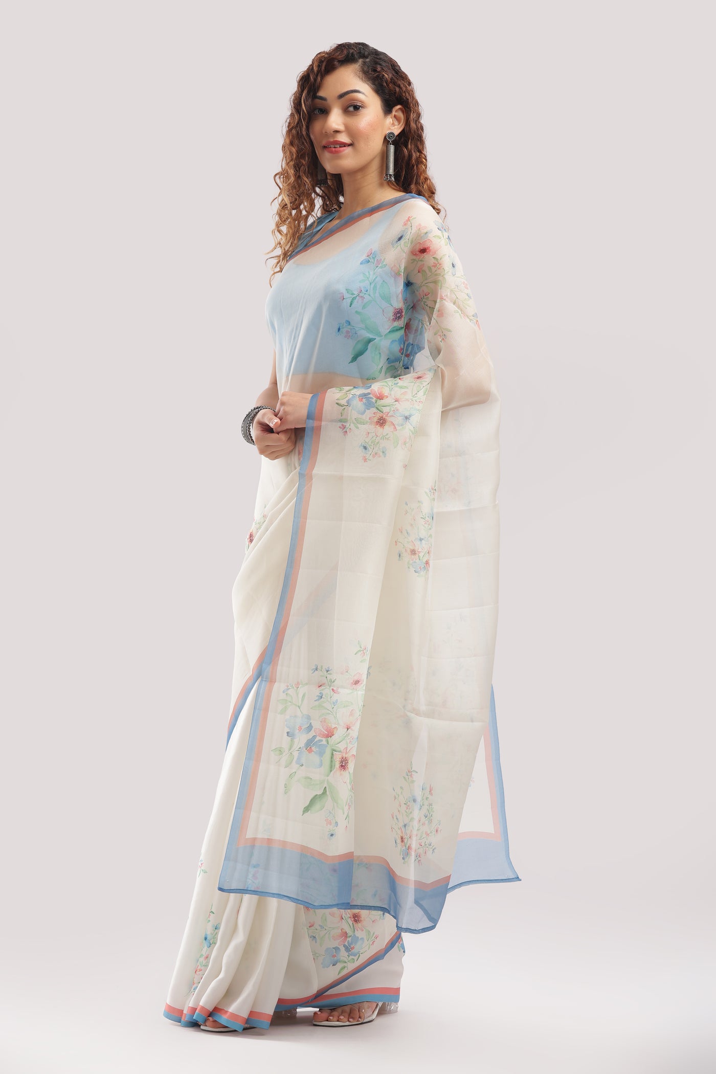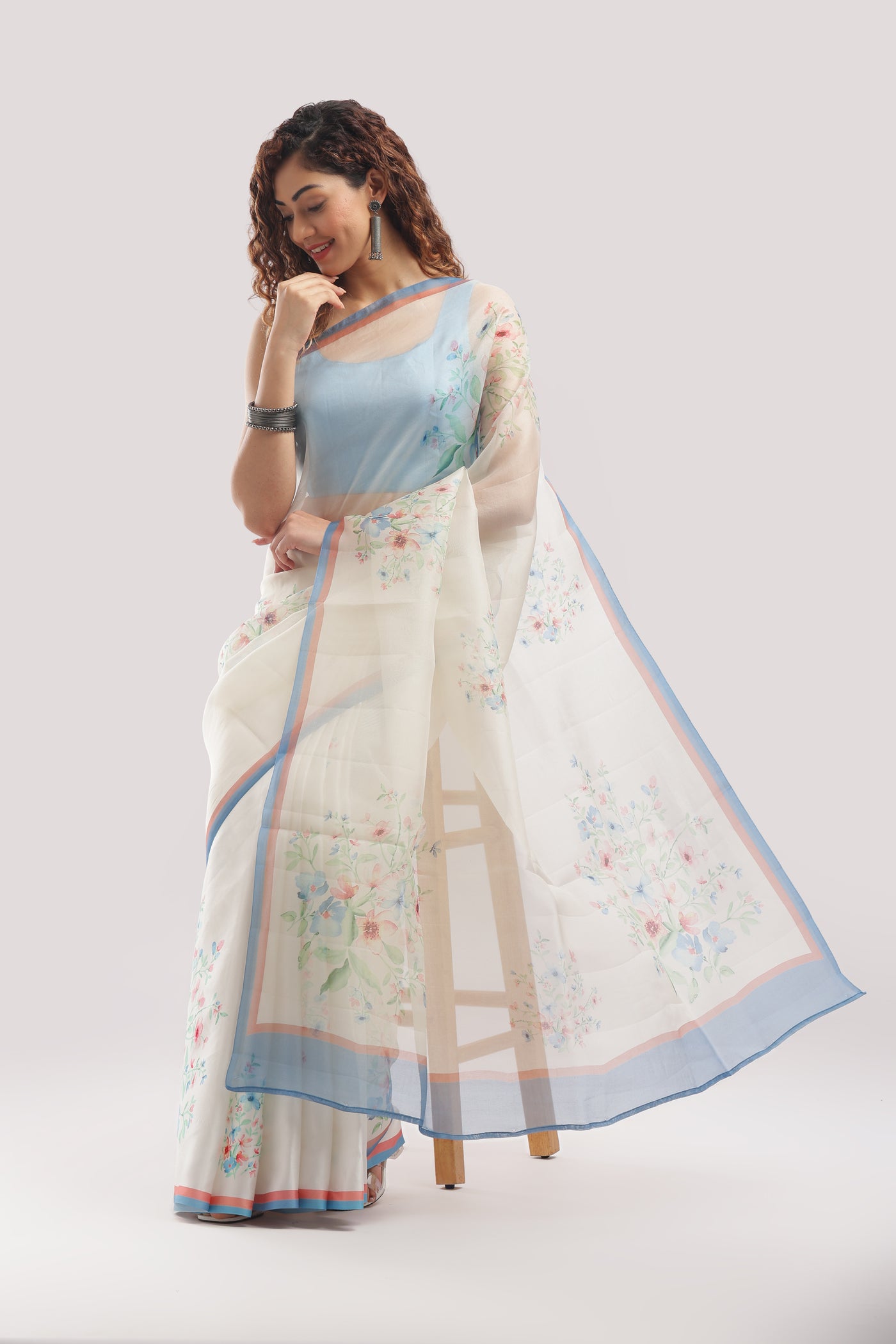 Fabric: Satin Silk Body with Organza Pallu Weave: Half and Half Work: Digital Floral Print with Contrast Border & Tassels Color: Ivory White with Pastel Floral Accents Occasion: Daytime Gatherings – Elegant Brunches – Intimate Celebrations Blouse: Unstitched (included)