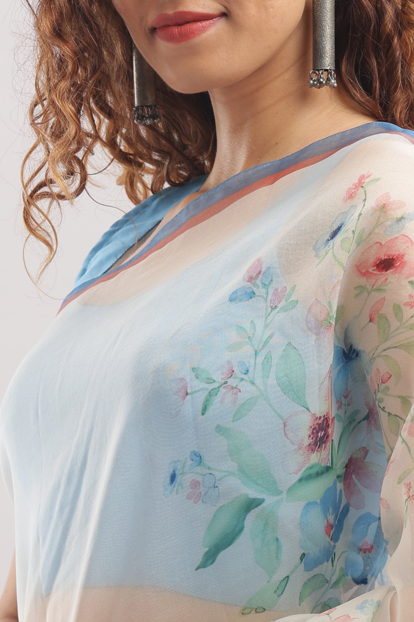 Ethereal charm meets modern finesse in this Silk Satin Body Organza Pallu Half and Half Saree in elegant ivory white. The body, crafted in fluid silk satin, drapes with a luminous softness, while the sheer organza pallu adds a gossamer lightness to the silhouette. Adorned with delicate digital floral prints in pastel hues of sky blue, blush pink, and soft green, the design evokes the freshness of a spring garden. A chic dual-tone border in powder blue and coral outlines the saree, finished with whimsical tassels for a playful twist. This half-and-half drape is a perfect balance of sophistication and breezy elegance.