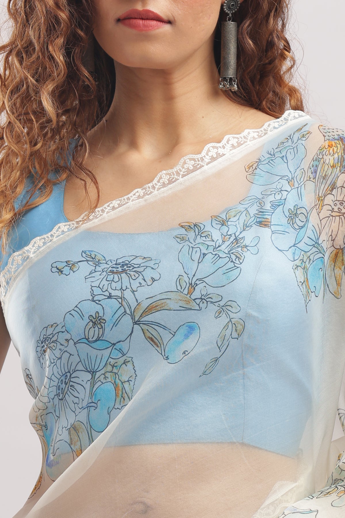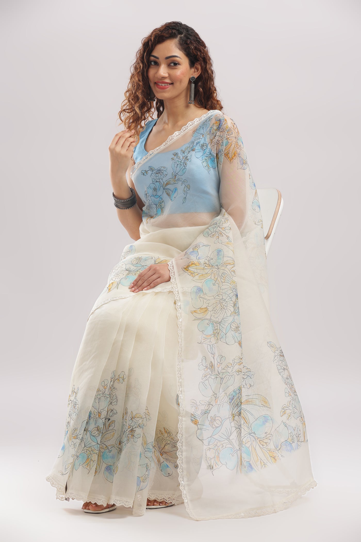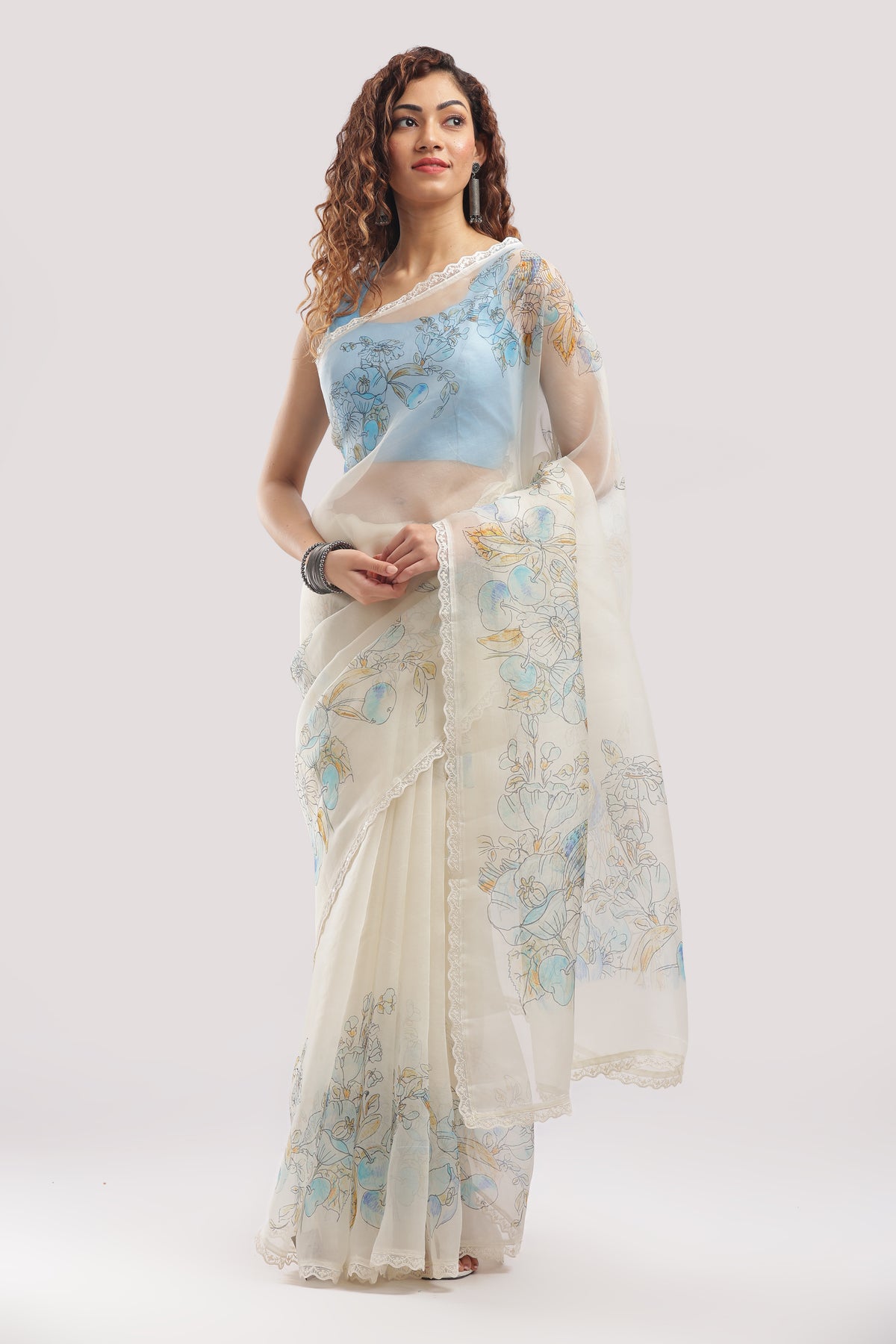 Comes with an unstitched blouse piece in matching sky blue to complement the floral motifs.