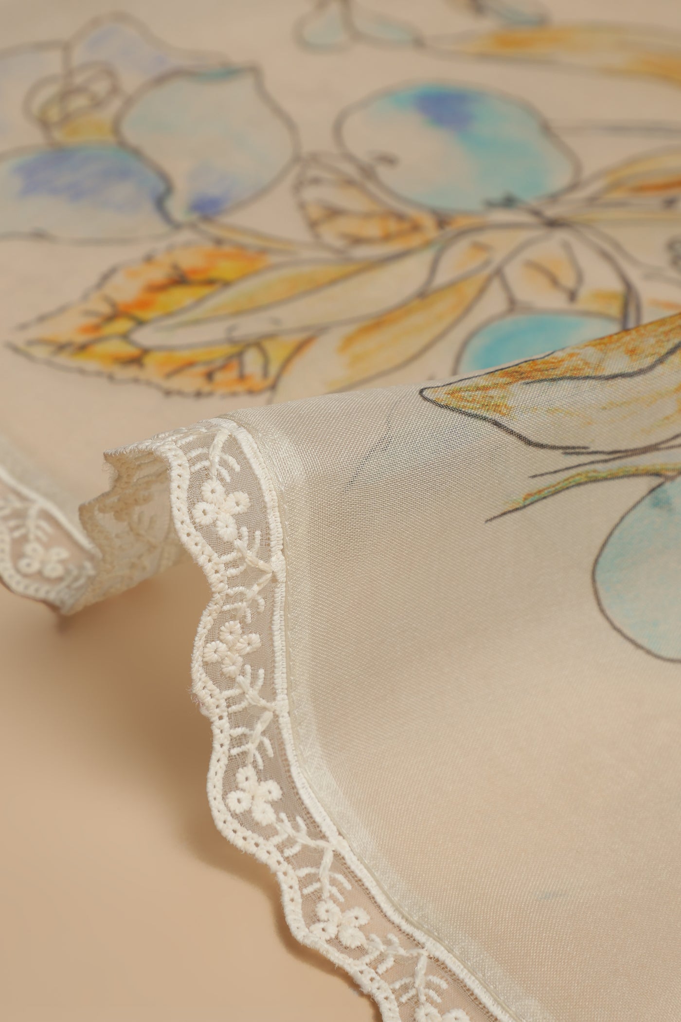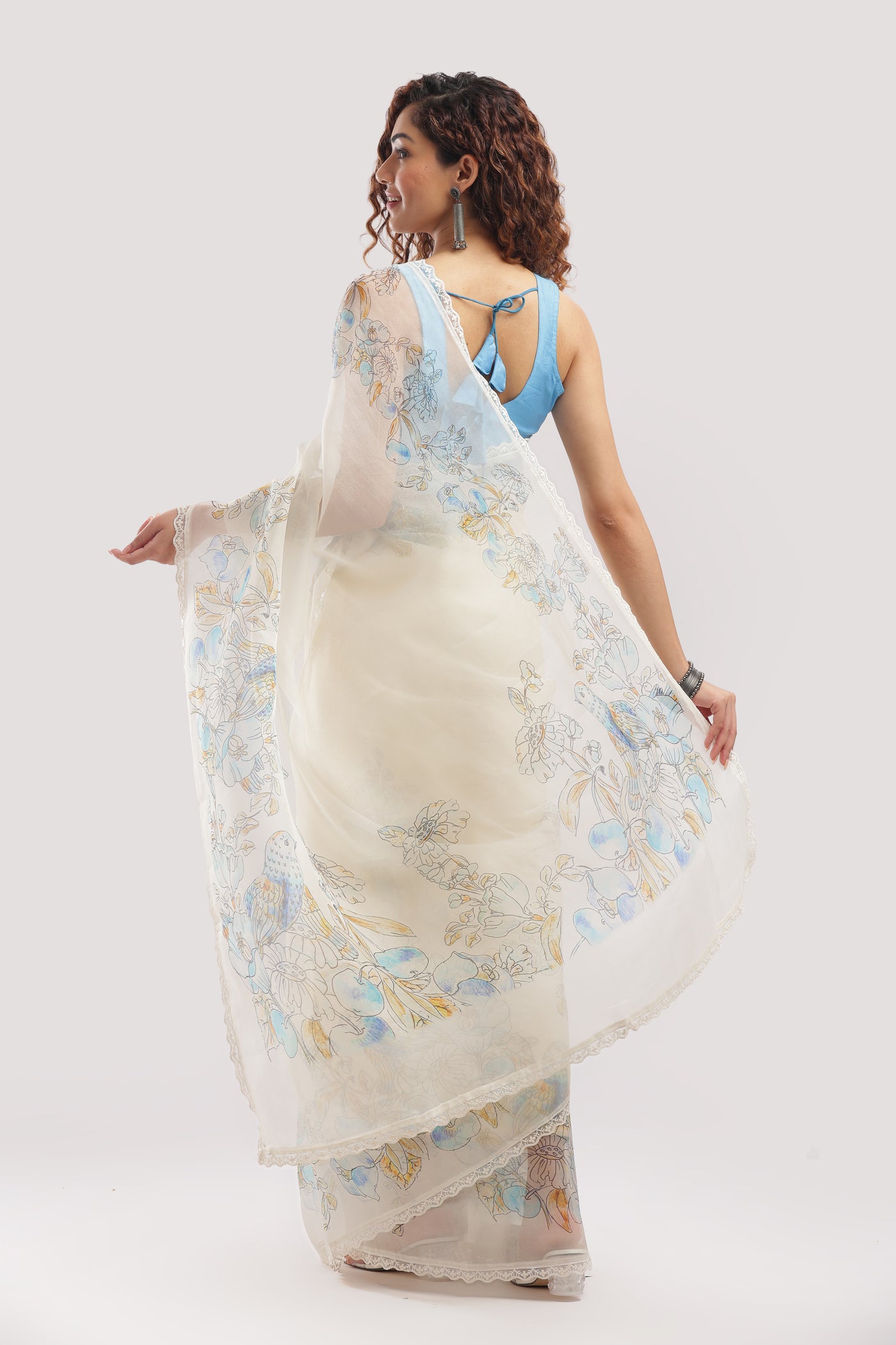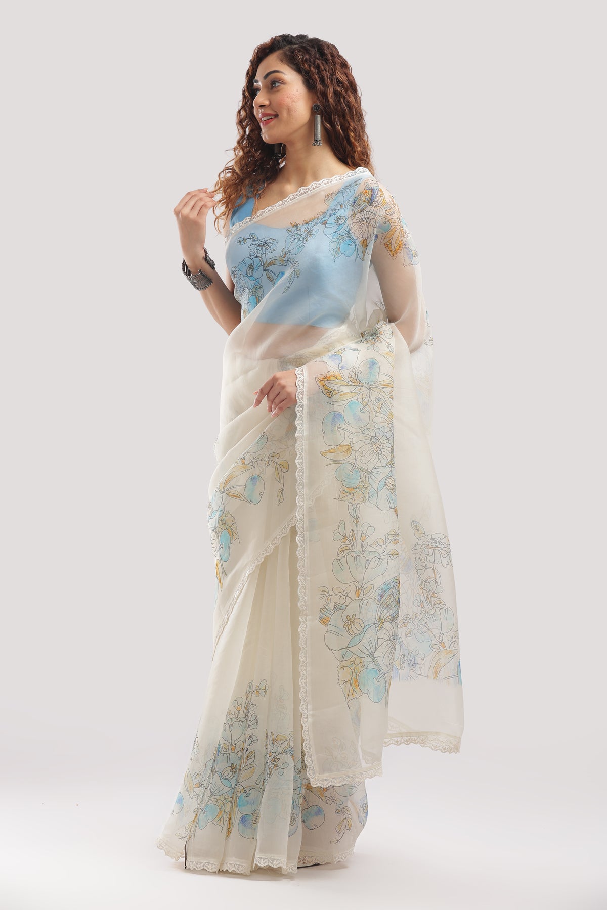 Fabric: Pure Silk Organza Weave: Banarasi Work: Digital Floral Print with Lace Border Color: Ivory White with Soft Blue & Yellow Motifs Occasion: Day Functions – Elegant Brunches – Light Festivities Blouse: Unstitched (included)