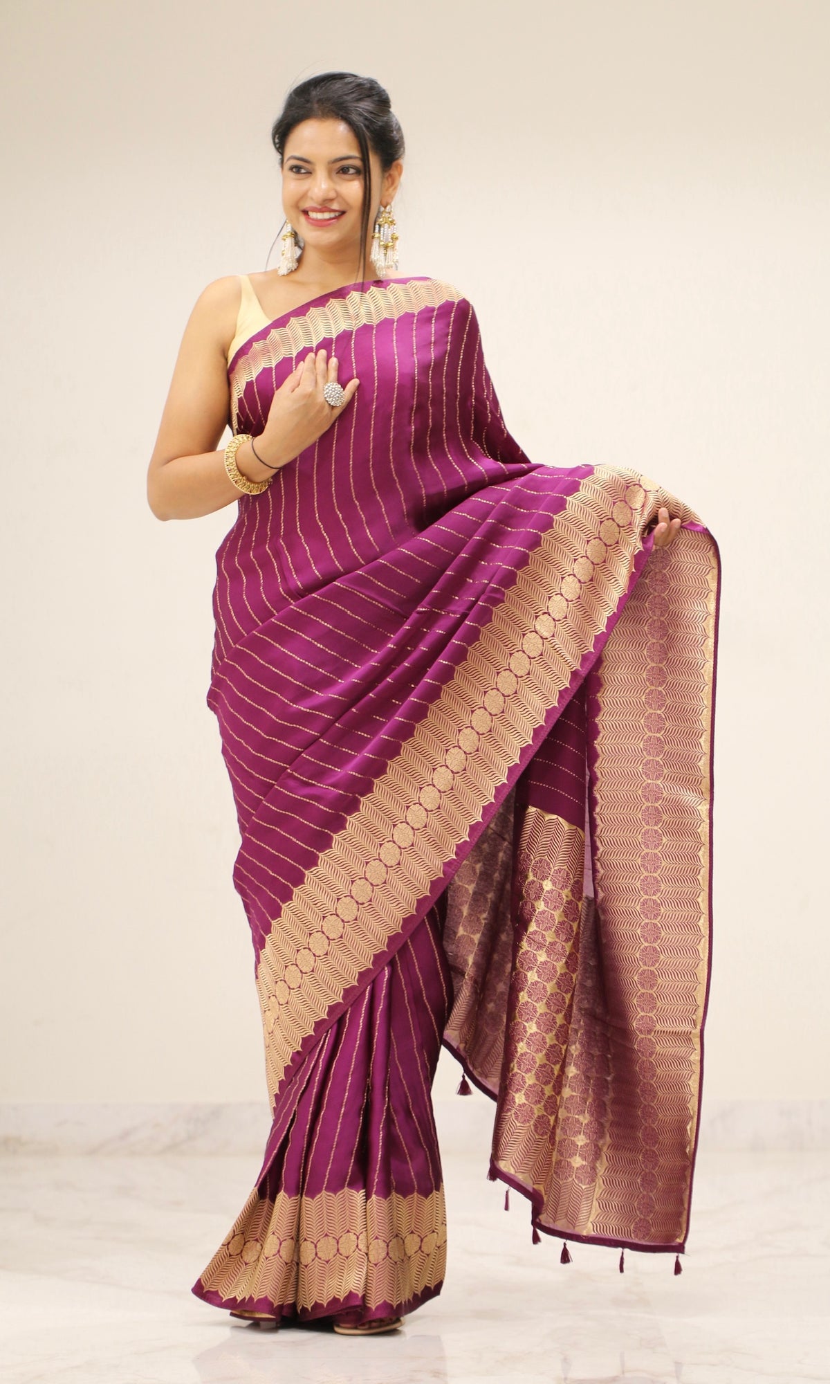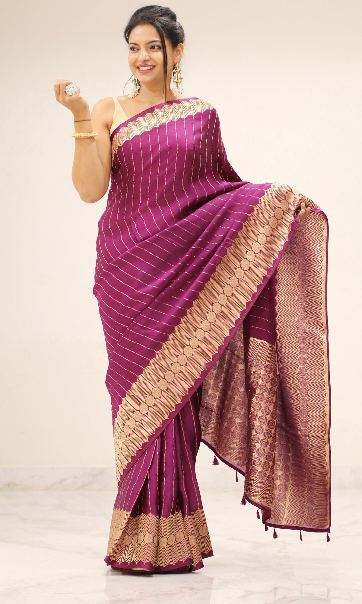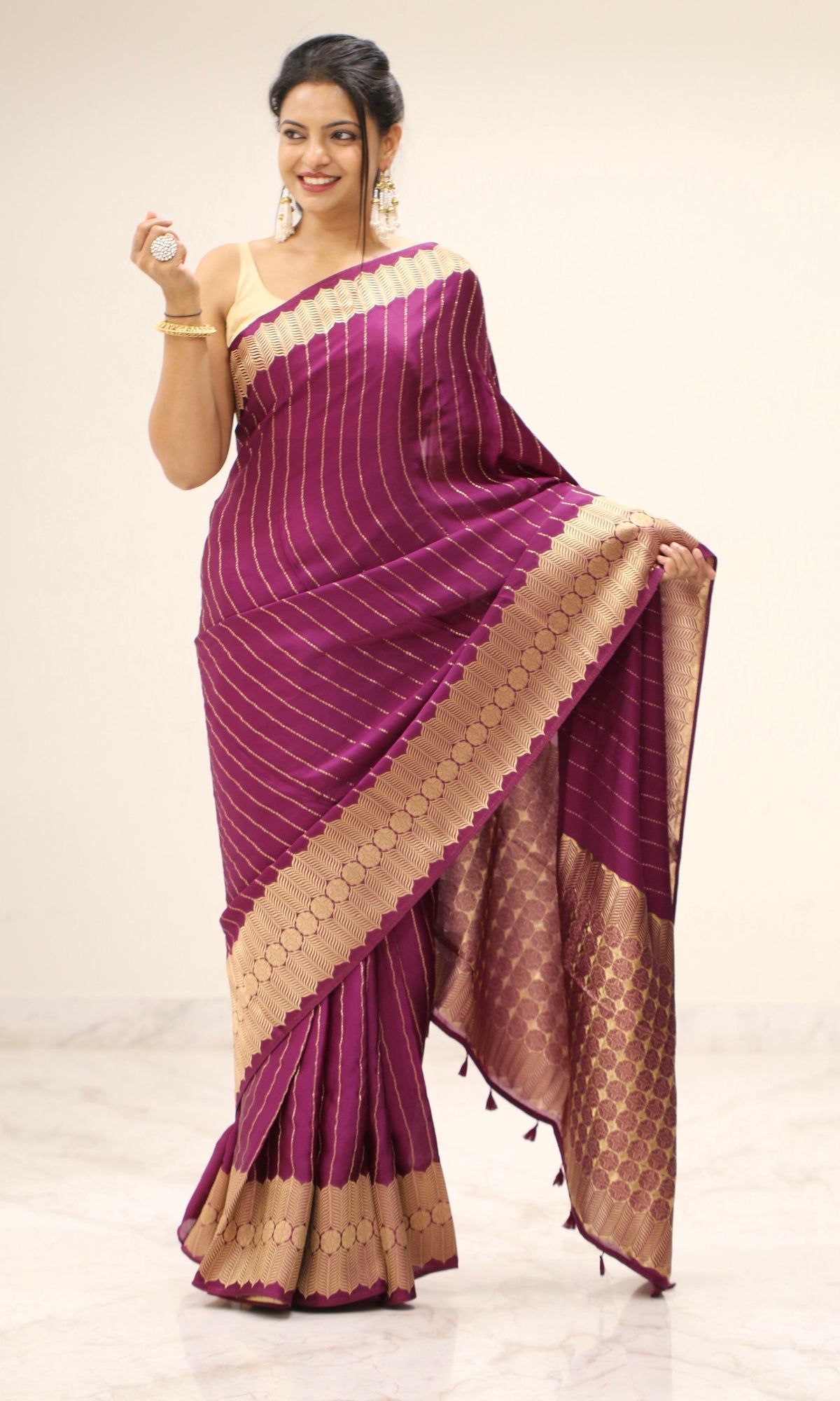 Step into refined elegance with this exquisite Banarasi Fancy Crepe Stripe Saree in Plum Purple, a perfect harmony of traditional craftsmanship and modern styling. Crafted from premium crepe fabric, it offers a soft, fluid drape that gracefully enhances your silhouette, making it ideal for festive events, celebrations, or sophisticated evening gatherings.