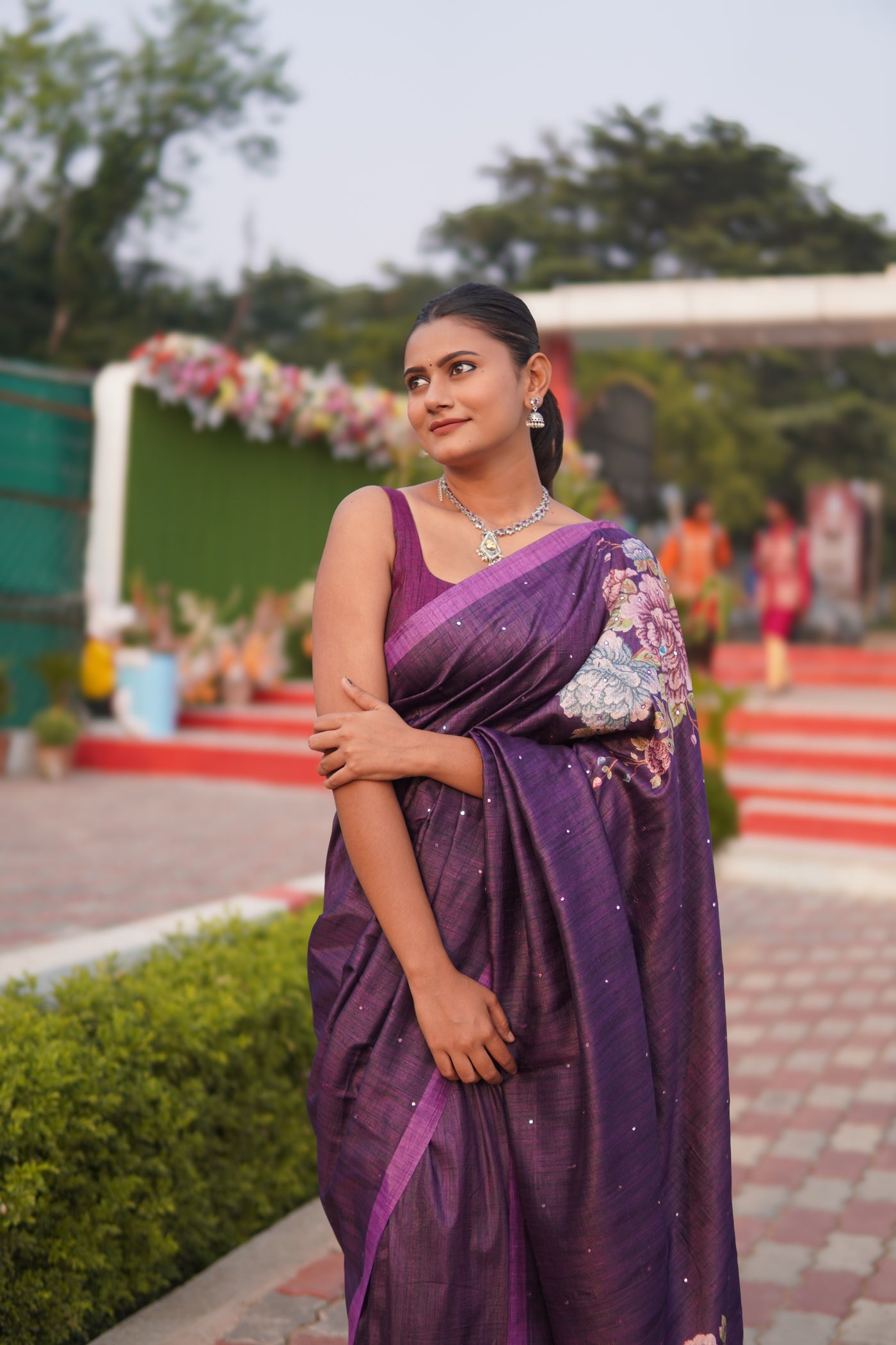 Banarasi Tusser Silk Butti Saree - Dark Purple