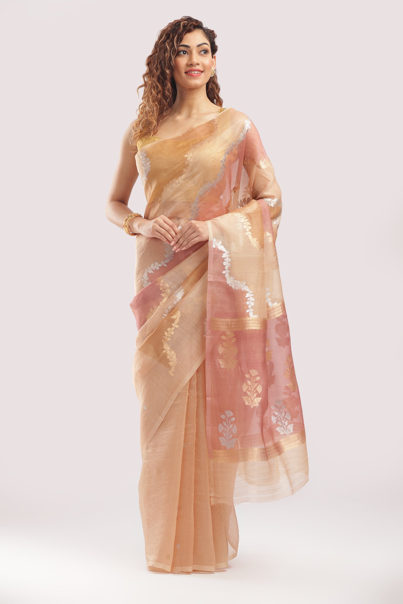 The saree stands out with its luxurious interplay of handwoven Sona (gold) and Rupa (silver) zari, featuring delicate floral and vine motifs that lend a subtle shimmer—perfect for both daytime and evening affairs. Its airy organza fabric drapes effortlessly, offering lightness with an opulent, sophisticated appearance that flatters every silhouette.